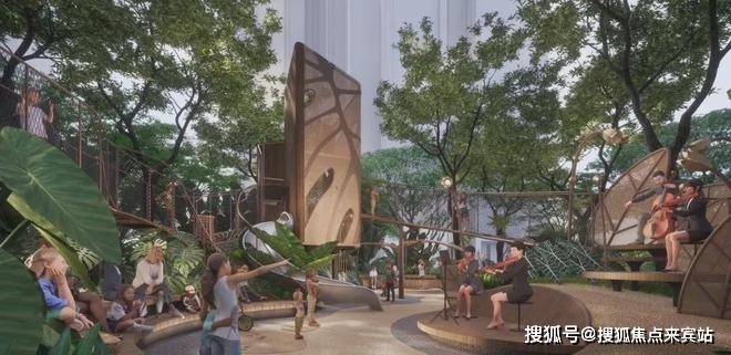【达尔文营地游乐场】:约1500㎡规模,营地以大叶王国为主题,将生态教育、艺术文化结合成为自然探索乐园、游乐场为一体的多元活动场景。同时于6栋架空层相连,配置儿童自由玩耍的空间。