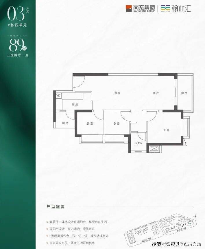 采用竖厅格局,客厅开间3.4米,实现LDKB一体化设计。L型厨房配备小生活阳台,卫生间采用三段式分离设计。得房率约71%(不含赠送部分),朝向为西南或东南。