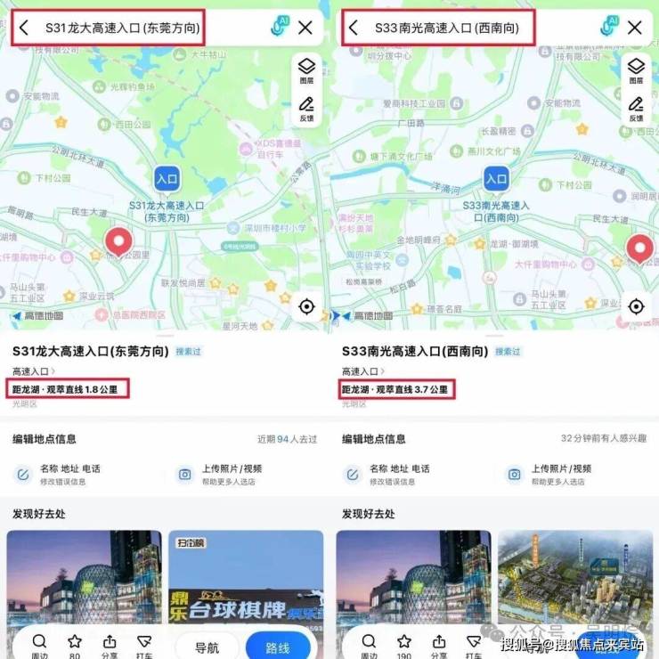 自驾可通过南光高速(2016年起永久免费通行)和龙大高速两条免费高速到达深圳各区,开车1.8公里可上龙大高速(如左图所示),3.7公里上南光高速(如右图所示)