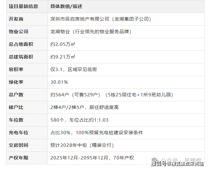 龙湖观萃苑,由龙湖集团打造,总占地面积约2.05万㎡,总建筑面积约9.21万㎡,计容建筑面积约7.72万㎡,容积率3.1,绿化率30.01%,共由5栋总高25层的住宅组成,分别是1/2/3/5/6栋,4栋是1所9班制幼儿园,另规划有菜市场、托育机构、长者服务站。总规划564户(住宅面积56423㎡,按照平均100㎡/套计算),1栋/2栋是2梯4户、3/5/6栋2梯5户设计,地下室有1层,规划580个车位,其中充电车位175个,车位占比约1:1.03。