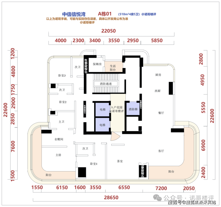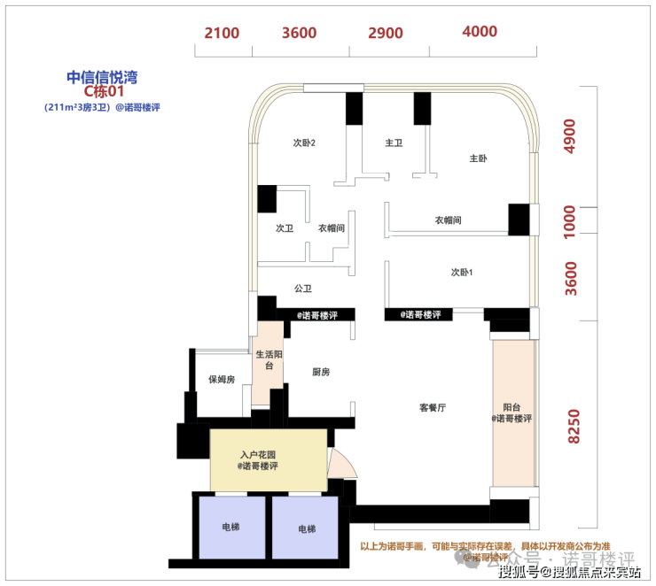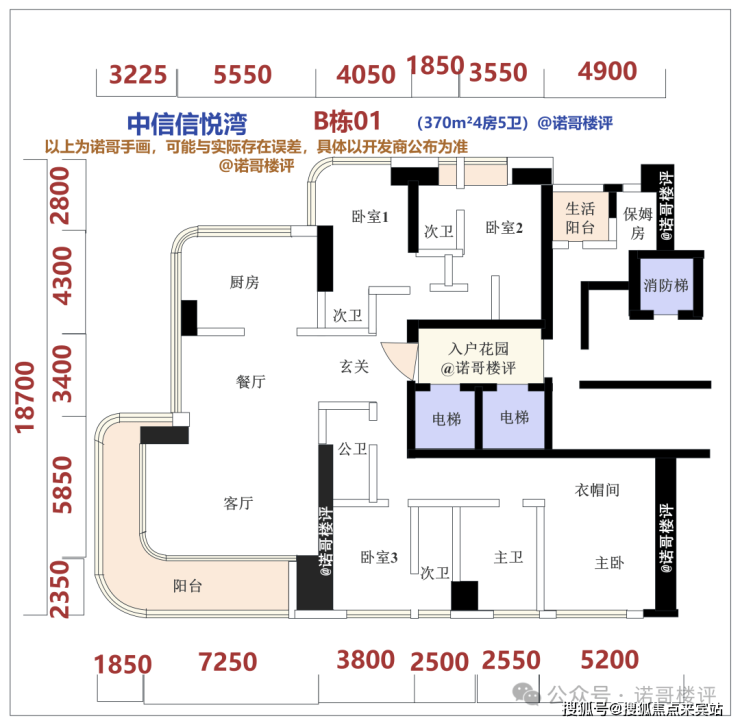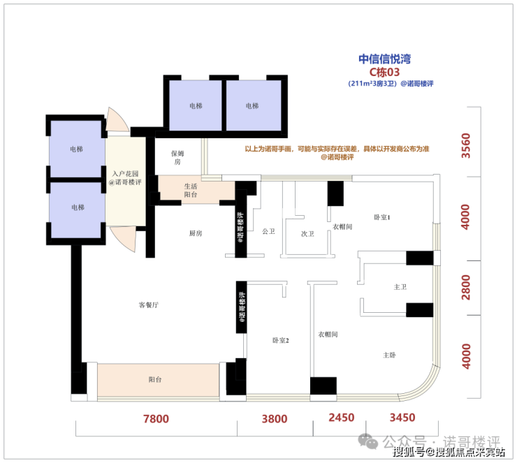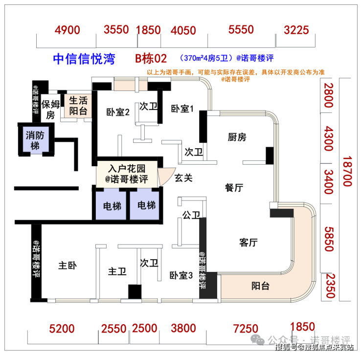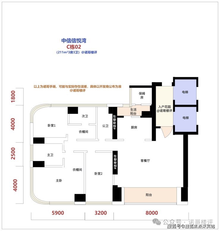 户型根据最新的设计图,211m²3房3卫、302m²4房4卫、370m²4房5卫、510m²4房5卫,基本都是电梯入户的设计