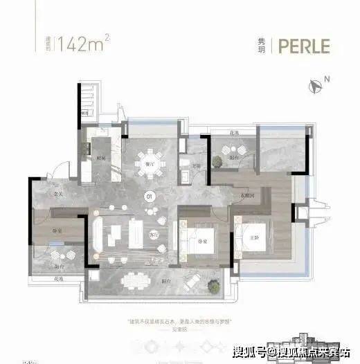 由于是新规后的产品,得房率很高。南向超大面宽,南北双阳台,主卧270度飘窗,尺度惊人,居住舒适度拉满。