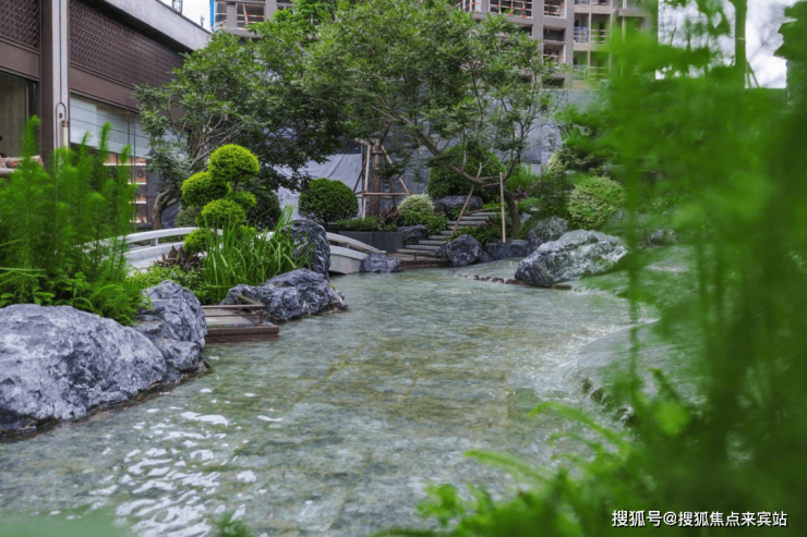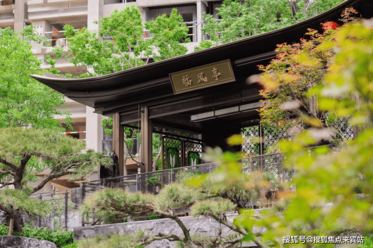 同时,借鉴了岭南四大名园之一的“可园”,用现代手法重新演绎,建造出一座约3.4万平方米的岭南东方诗意园林景观,利用场地高度差特点,采用叠石理水的传统造园手法,打造青石飞瀑相依的场景。