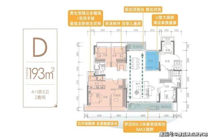 除了带有143㎡的南北通透,五开间朝南,双套房设计,193㎡的户型更惊喜的是奢阔阳台、中西双厨、主卧双衣帽间的设计。