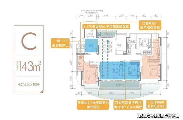 这款户型拥有一处约7.6米长的阔景阳台,它与生活阳台(约3.5米)形成对流,为家人提供了一处舒适的休闲空间。无论是欣赏美景还是享受悠闲时光,都极为便捷。此外,其百变空间的设计极具灵活性,可根据需求打造成约7.6米的大横厅,瞬间营造出宽敞的空间感。