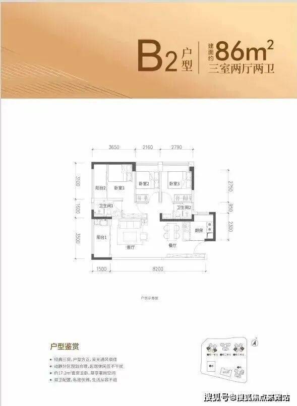 86㎡的3房2厅2卫,设计的是竖厅格局,客厅3.5米开间,进深8.2米,LDKB一体化设计,三开间朝南,3个卧室分别做到了主卧14.76㎡/次卧9.06㎡/次卧7.02㎡(包含墙体飘窗),U型厨房,公卫三段式分离,得房率约88.08%(包含赠送),东南或西南朝向。