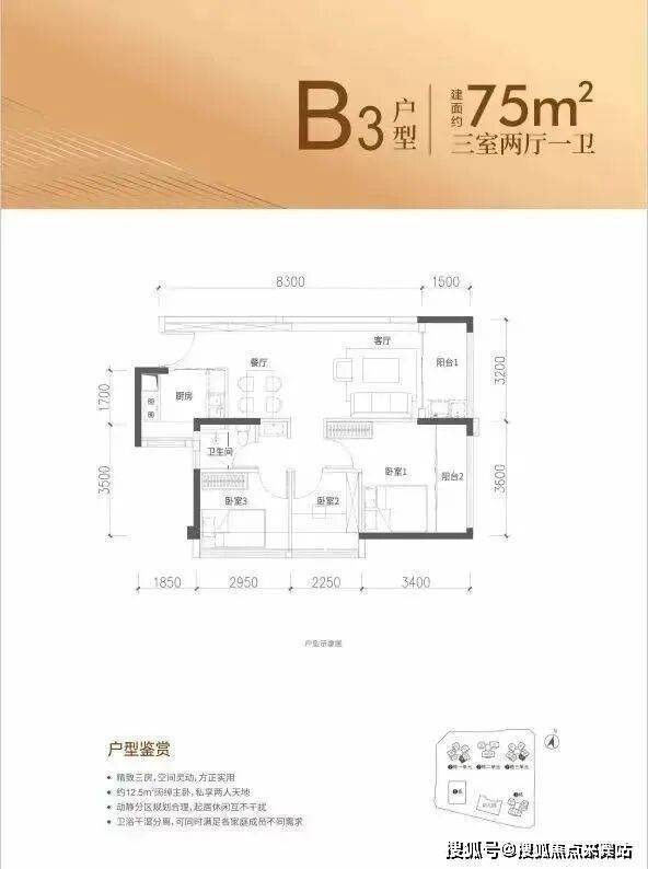 75㎡的3房2厅1卫,设计的是竖厅格局,客厅3.2米开间,进深8.3米,LDKB一体化设计,3个卧室分别做到了主卧13.24㎡/次卧8.85㎡/次卧6.75㎡(包含墙体飘窗),U型厨房,卫生间三段式分离,得房率约91%(包含赠送),东南朝向。
