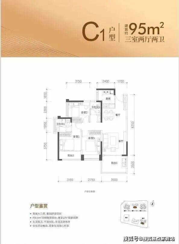 95㎡的3房2厅2卫,设计的是经典竖厅格局,客厅3.5米开间,进深8.35米,LDKB一体化设计,三开间朝南,3个卧室分别做到了主卧13.8㎡/次卧10.31㎡/次卧9.13㎡(包含墙体飘窗),U型厨房,公卫三段式分离,得房率约90%(包含赠送),西南或正南朝向。