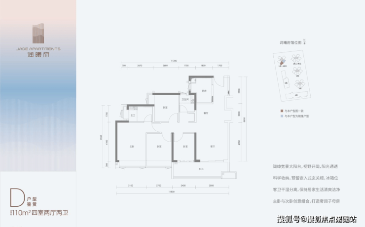 建面约110㎡四房户型,拥有约5.4米南向横厅,不仅采光通风视野更好,还可以个性化打造书房或亲子活动区;四间卧室均带有宽幕飘窗,增加空间使用率的同时也将四季风景引入室内。