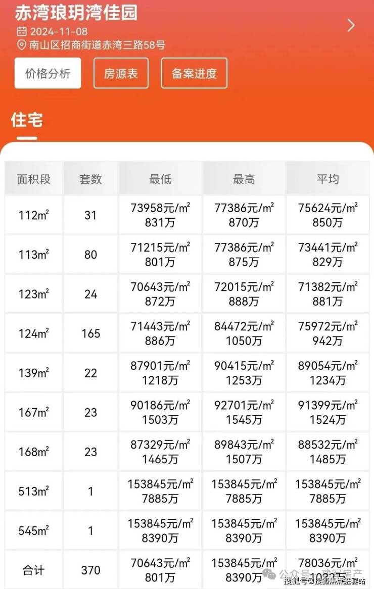 南山赤湾,南山1978·半岛擎峯,备案名:琅玥湾佳园于2024年11月8日取证入市,本次推出1/2栋,共370套房源,面积有113平的3房2卫,124-140平的4房2卫,167平的5房3卫户型,备案均价7.8万/㎡,备案单价7.06-9.27万/㎡,总价801-1545万/套,计划在2026年3月份带精装交房。