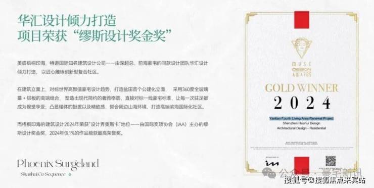 建筑大师:特邀深超总/前海豪宅同款设计团队华汇设计操刀,其作品从全球近3.8万件中脱颖而出,斩获有“设计界奥斯卡”之称的2024年国际奖项协会(IAA)缪斯设计奖金奖,该奖项仅约1%作品可获最高荣誉;