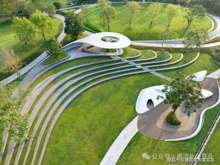在有限的空间内,琶洲南TOD将滨河公园、高线公园、绿廊中轴巧妙地穿插其间。其中最典型的便是国际滨河公园,以世界级造园美学,打造CBD稀缺的亲水驳岸,让繁华深处藏着一片静谧的后花园;15米悬挑观景台则以“超前视角”定格珠江柔波与城市锋芒的交响,而阶梯式水岸剧场的涟漪弧线,既是艺术雕塑,也是邻里相聚的露天沙龙。
