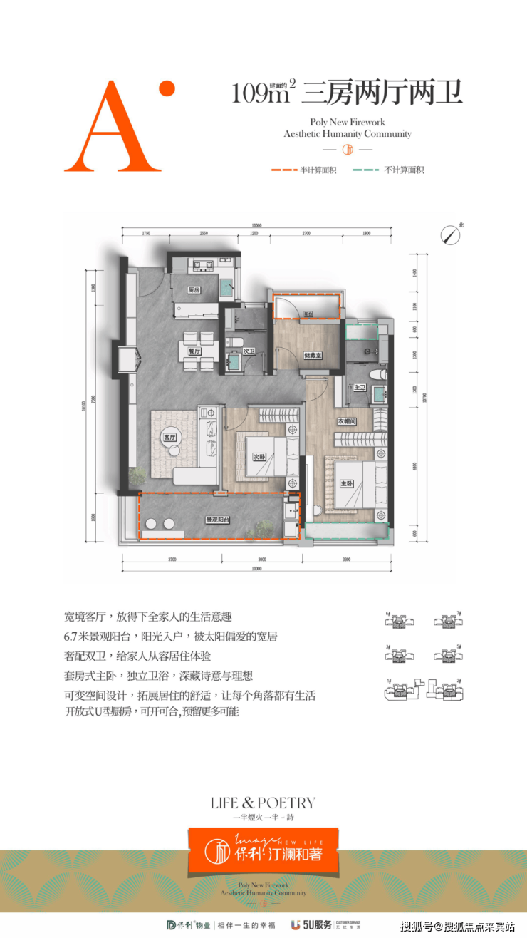 以 109㎡三房为例,宽境客厅承载全家生活意趣,6.7 米景观阳台阳光充足,套房式主卧独立卫浴,可变空间拓展居住舒适感 。