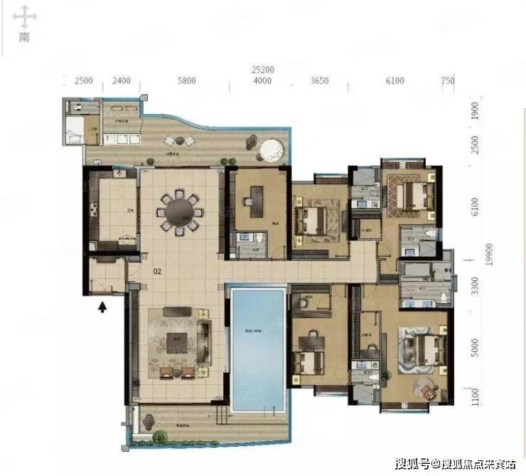 主力产品集中在H栋的空中御墅系列,建面约328–586㎡,层高达约4米,6.7米大开间连通餐客厅与阳台,实现极致通透感。部分户型更配备私家泳池,例如建面约414㎡的六房六卫带泳池单位,以及586㎡九房八卫的复式泳池大宅,空间尺度堪比一线城市的顶级豪宅。这类产品不仅适合多代同堂的大家庭,也具备极强的资产配置属性。