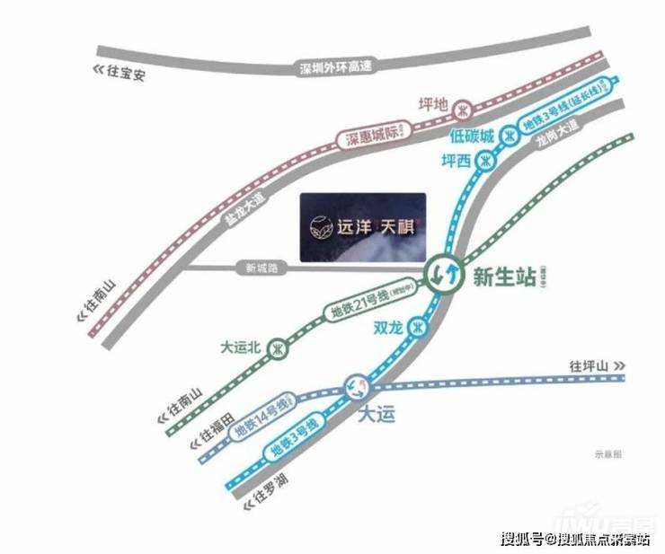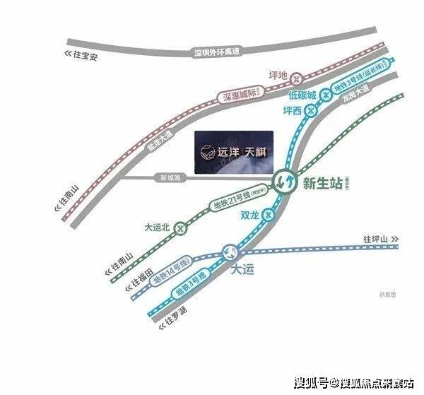 远洋天祺双地铁:项目仅500米(直线距离)即享地铁3号线延长线 (预计2025年通车)与21号快速线(规划中)双轨交汇新生站(建设中);项目毗邻新城路、龙岗大道、盐龙大道、深龙翔大道,外环高速等城市干道,40分左右可抵达市区。
