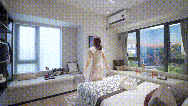 单是进深(含飘窗)约4.6米的大尺度主卧,飘窗就有2个,3面采光的神仙设计,让整个房间通风采光更佳,视野上也更通透。