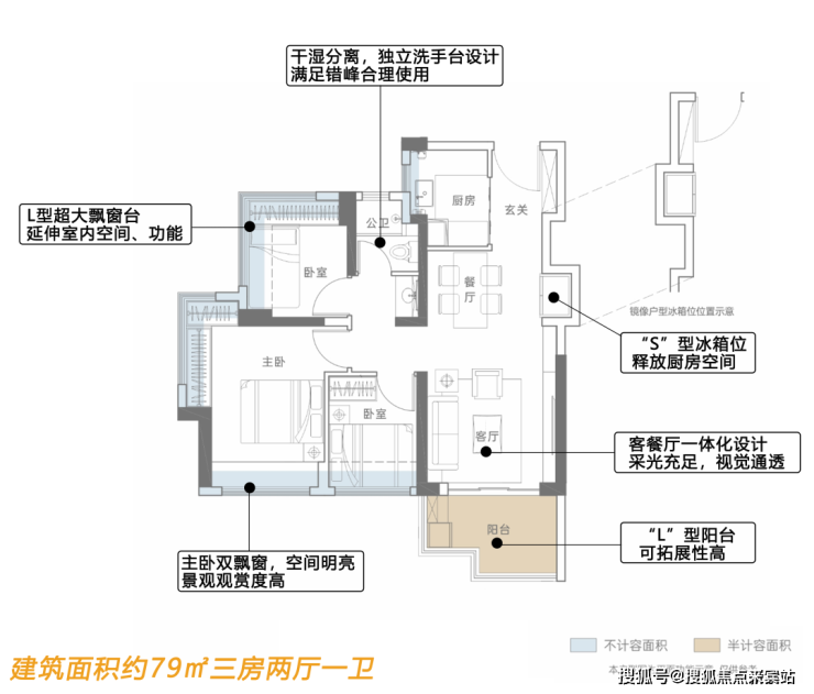首先是项目瞄准刚需诉求,结合多项目经验,最终在兼顾实用性的同时,尽可能降维总价幅度创新性打造的建筑面积约79㎡和89㎡三房产品,从设计来看,亮点满满。