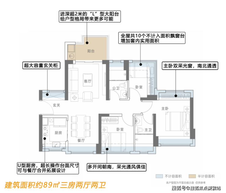 如建筑面积约89㎡产品,南北通透基础上,便有足足有10个飘窗,极大提高每一处空间的实用率。
