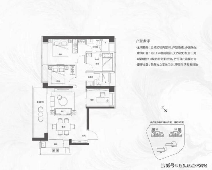 【124㎡的3+1房2厅2卫】1栋02/2栋04户型,电梯入户送独立公区,设计的是竖厅格局,动静分区,主卧套间设计,还有一个多功能间可以做书房,U型厨房,公卫三段式分离,得房率:72.07%(不含赠送)西南朝向;