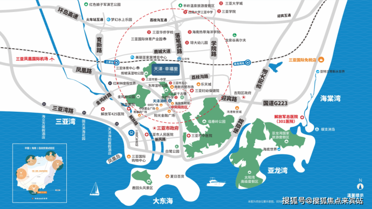 近揽东岸总部中央商务区、乐天城综合体、鸿港新贸城、海旅免税城等商圈,项目西北侧在建亚沙会体育中心,总部办公、商业、酒店、影院、体育赛事等高规格醇熟配套一应俱全。
