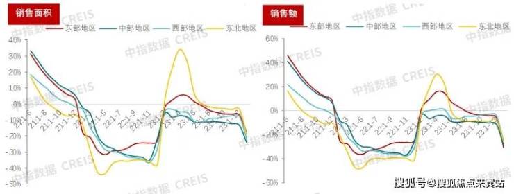 图:2021年以来全国不同地区新建商品房销售面积和销售额同比走势