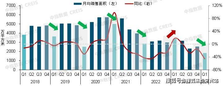 图:2018年至2024年100个代表城市新建商品住宅各季度月均成交面积及同比走势