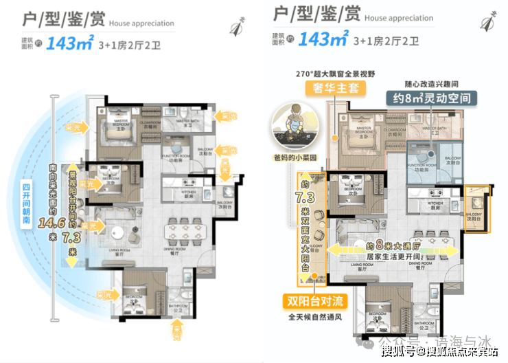 领南府推出约98-143㎡的多种户型选择,涵盖2+1房至3+1房的不同面积段,适合不同家庭结构的需求。所有户型均采用全南向设计,确保每个房间都能获得良好的采光和通风效果。部分户型特别设计了豪华主卧套房,配备270°转角飘窗,增加了居住的私密性和舒适度。此外,户型设计注重动静分区,客厅与卧室分开布置,营造出安静和谐的家庭氛围。