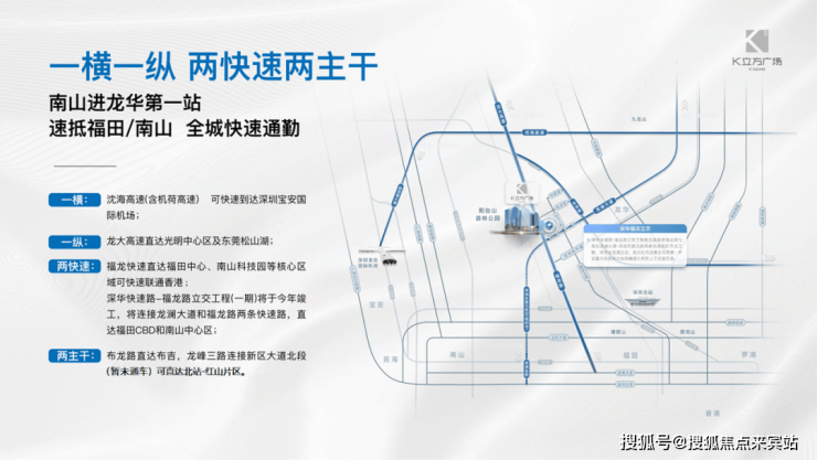 两快速:福龙快速直达福田车公庙,可快速联通香港。深华快速路-福龙路立交工程(一期)将于今年竣工,连接龙澜大道和福龙路两条快速路,未来侨城东路北延线开通后,一站直达南山中心区