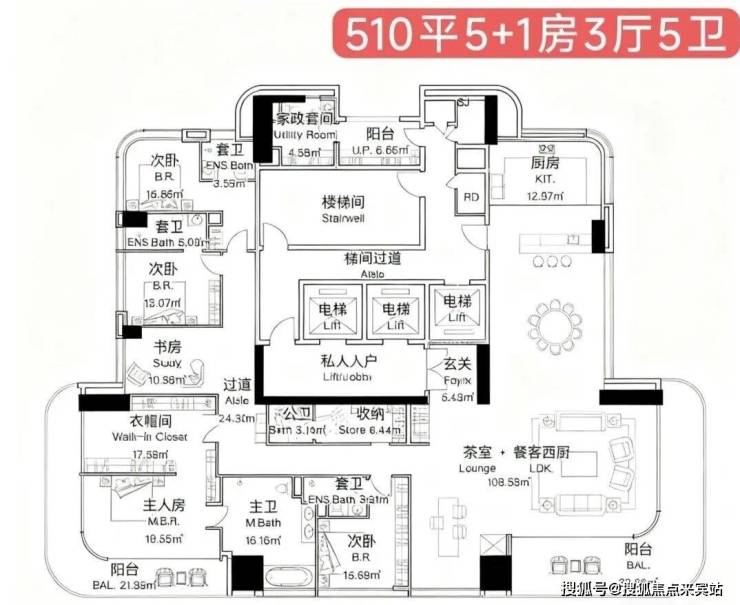 1栋A座:约510平方米户型(部分资料显示为495㎡),层高3.6米,总高165.77米,共43层,采用3梯1户设计。这是项目的顶级产品,整层仅一户,独享约510平方米的恢弘空间,私密性登峰造极。