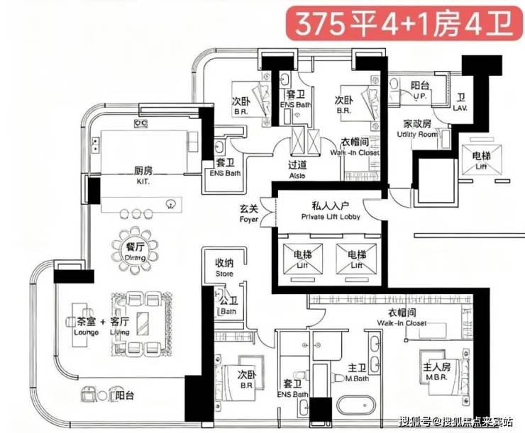 1栋B座:约375平方米户型(部分资料显示为350㎡),层高3.5米,总高180.17米,共47层,采用5梯2户设计。该户型空间阔绰,保障居住舒适度与私密感。