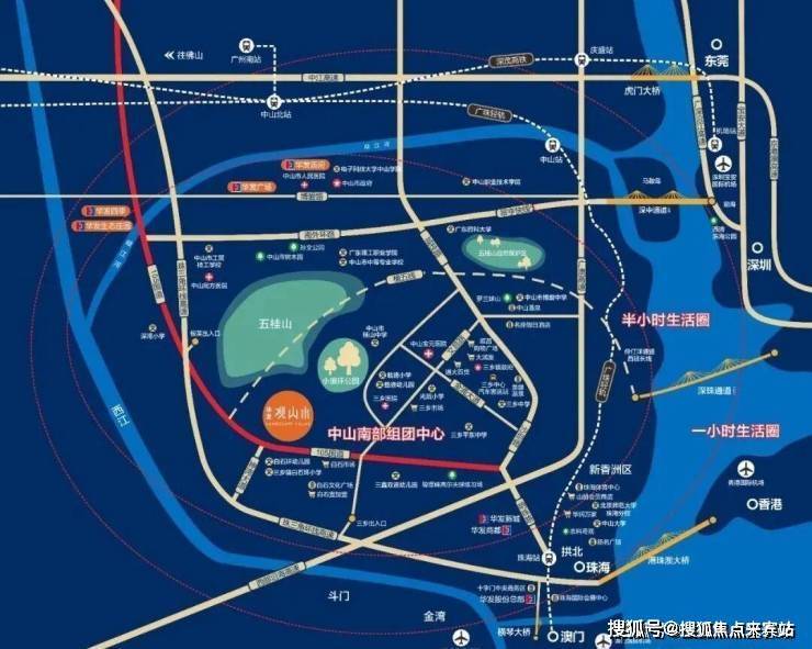 1、港珠澳后花园:华发观山水傲居湾区枢纽芯位——中山南部组团主中心(名称来源中山市南部组团发展规划公示),多维交通路网接驳,邻珠澳通港深,享有“港珠澳后花园”美誉。让您锐意驰骋湾区繁华同时,又能轻松归享湖山静谧闲逸,邂逅生活的本真。