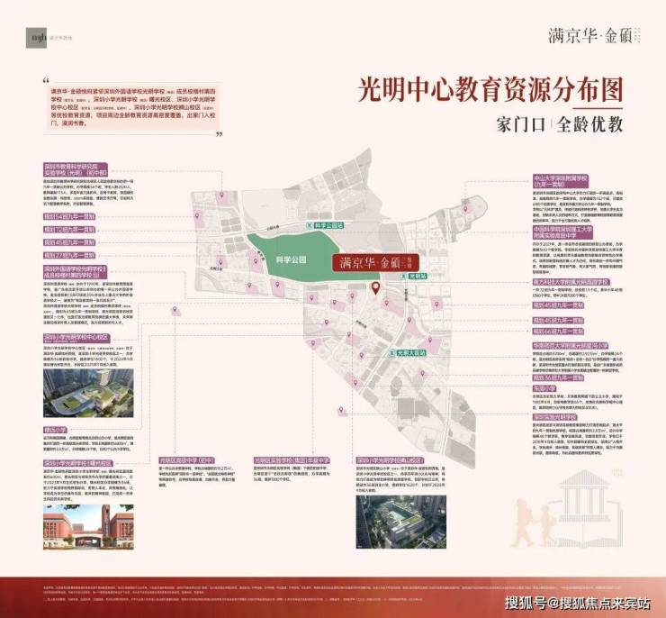 满京华·金硕项目直面占地约208万㎡的科学公园(在建中),近享深圳国际美术馆(暂定名、在建中)、深圳科学技术馆、科学城体育中心(在建中)、会议中心(规划中)等市政级文体配套;还坐拥狮山公园(规划中)、约9.4万㎡的东周文化公园,约10万㎡的开明公园,约56万㎡的新城公园等丰富绿色生态资源。
