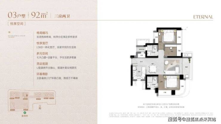 3、新规户型,“方厅+270主卧+三面采光”,使用率超过90%,实用性强过前几年设计的新盘不少。