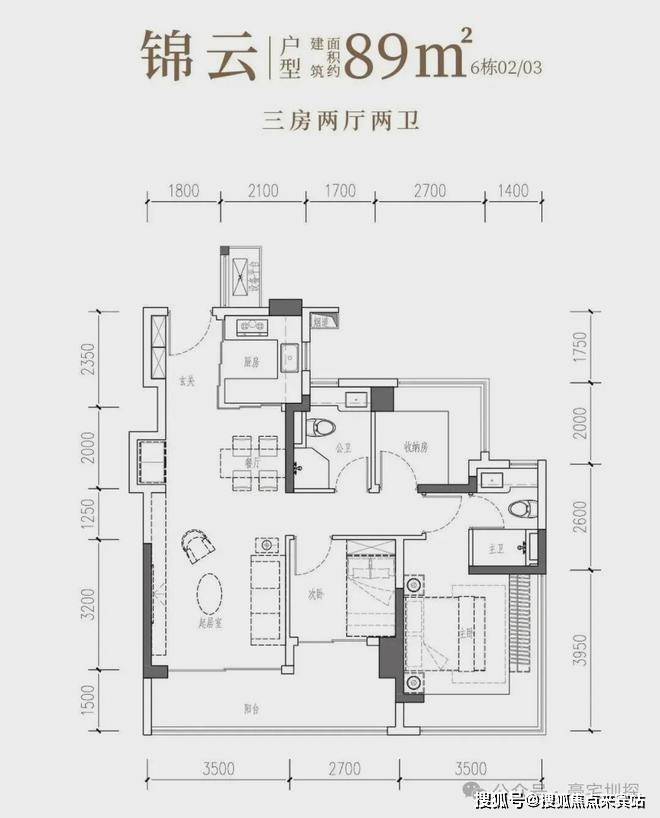 以LDKB无界场域盛放温情,以阳光长廊安放志趣,更以270°环幕主卧,升华为奢适的私密天地。• 锦云·建面约89㎡3房2厅2卫:南向阔厅,景致常驻,间间开阔,尺度舒适