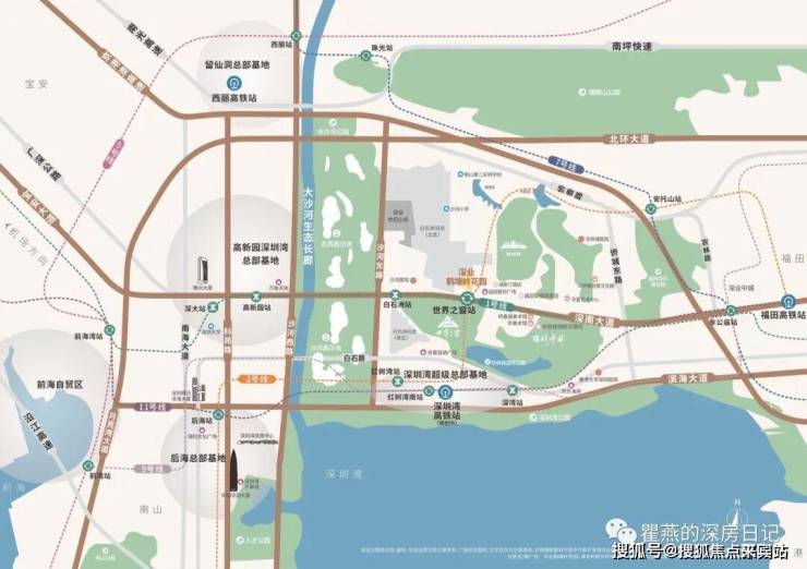 价值点三:城市中心枢纽 从容通达全城五轨四横三纵中心枢纽:深南大道头排,下楼即达1/2号线世界之窗站,周边还有7、9、11号线,5轨环绕;通过换乘地铁11号线,2站到福田高铁站,3站到前海,5站到宝安国际机场,乘坐2号线,直达蛇口太子湾邮轮母港邮轮母港,联通世界的海上门户。