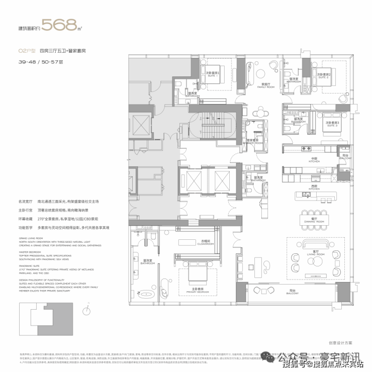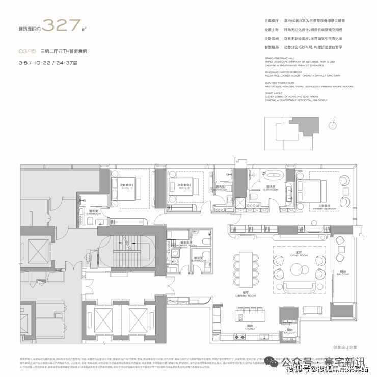 公寓主力户型为303㎡、326㎡、404㎡、572㎡等大平层,最大户型达1000㎡