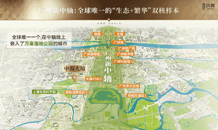 它的左手,是广州中轴的繁华脉络;右手,是11平方公里的国家湿地公园,万亩绿洲推窗即见。