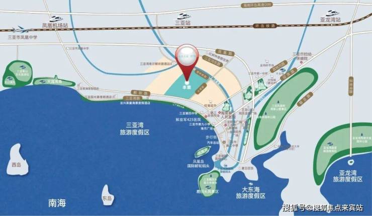 北连河东路、凤凰路,西南紧邻解放路;距三亚凤凰国际机场约10公里,距三亚高铁站约3公里,距有轨电车水城路车站约1公里,距G98环岛高速火车站互通约6公里。