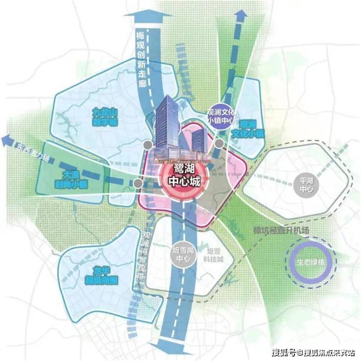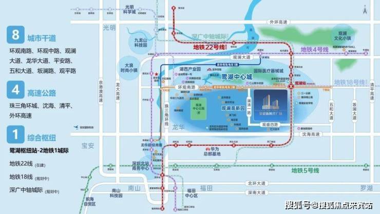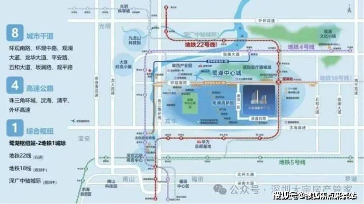 • 龙华产核——鹭湖中心城地处龙华万亿级数字经济圈、梅观创新走廊的交汇中心,亦是龙华六大重点片区的核心枢纽