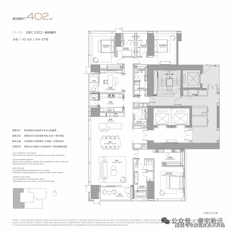 公寓主力户型为303㎡、326㎡、404㎡、572㎡等大平层,最大户型达1000㎡