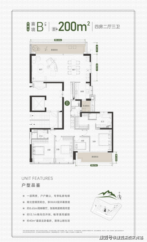 同样的专梯入户,豪宅感扑面而来,该户型为顶级大户型,四阳台设计,最大有10.55米的景观阳台和180度视野的餐客厅空间奢阔气场尽显,罕见的南北瞰景四阳台设计,让家的每个角落都能欣赏美丽的山景和城市景观。所有的开窗面都尽可能放大,客餐厅、书房、卧室、几乎都能享受超宽超大屏