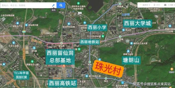 项目西侧为西丽留仙洞总部基地,东北侧为大学城,东侧为塘朗山,西南侧是西丽高铁站。