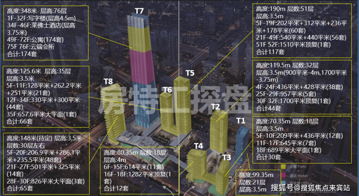 深圳湾一号总建筑面积47.5万㎡,由8座塔楼及1座商业建筑组成,分为南北两区,北区分为:T1写字楼、T2、T3、T4公寓;南区分为:T5、T6、T8公寓,T7为环球商务中心。