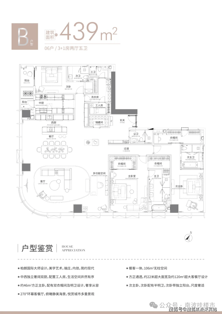 B户型439㎡:3+1房,2厅,2厨,5卫,西南向,全套房双主卧,次卧带阳台