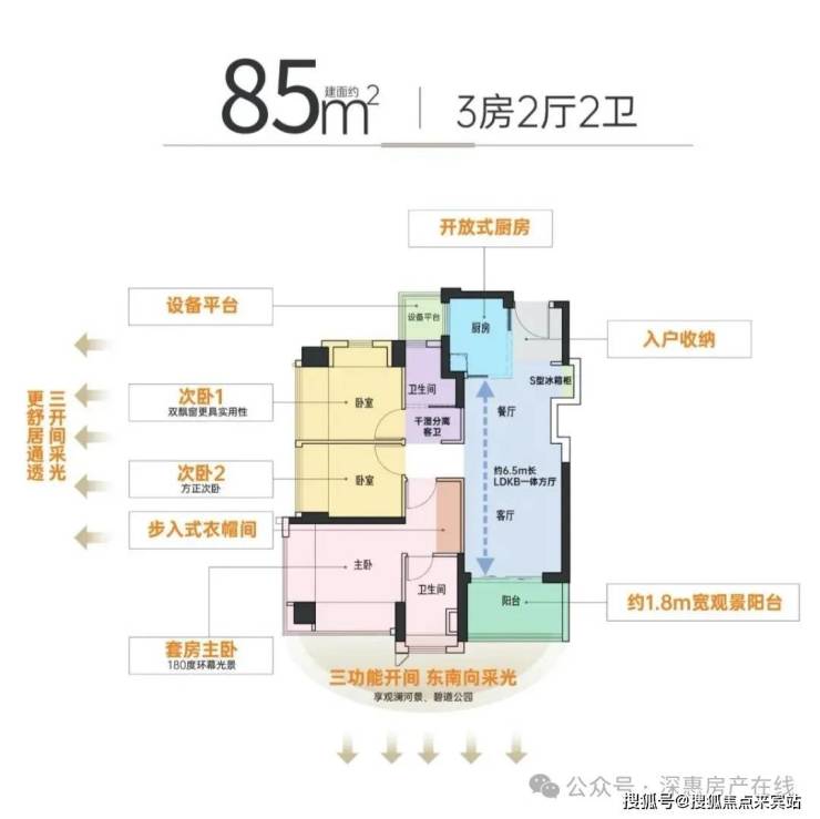新规升级75㎡做2卫,市场同面积做1卫,卧室180度环幕采光,S型墙体设计冰箱位,使用空间更合理,干湿分离两空间公卫,兼并走廊空间更宽阔,客餐厅一体化设。