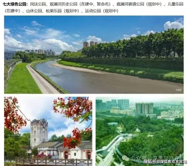 一河七公园:观澜河,民法公园、观澜河历史公园(在建中,暂命名)、观澜河碧道公园(规划中)、儿童乐园(在建中)、山体公园、松果乐园(规划中)、运动公园(规划中);