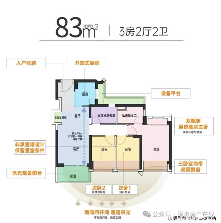 4开间东南向采光,赏碧道公园、看园林景观,主卧室通透双面采光,收纳更轻松,S型墙体设计冰箱位,空间利用更合理,2个卫生间方正格局,有飘窗更省空间。