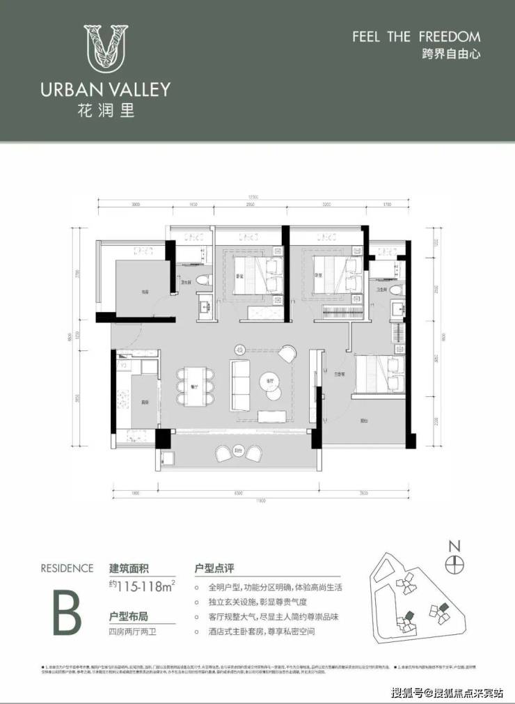 约115-118㎡的产品分别每个楼栋都有一条腿,设计独立玄关,功能分区明确,客厅大气,尺度疏阔。