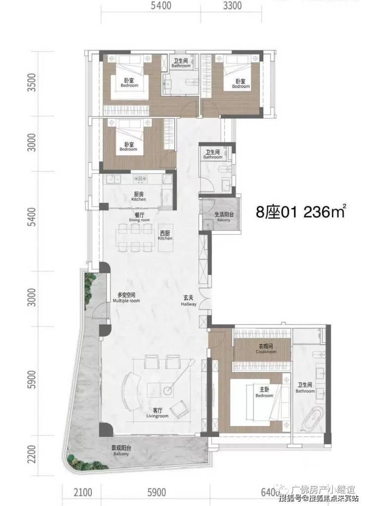 8栋01户型是建面约236㎡的四房两厅三卫、双套房主卧、中西双厨设计、超大方厅,整体空间尺度阔绰,客厅开间近6米,光客厅都65个方,转角弧形阳台19米长,非常奢侈