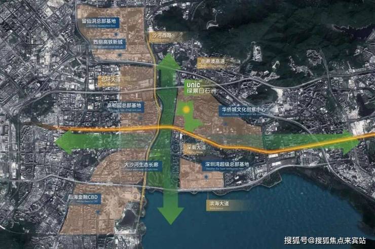 绿景白石洲位于深圳核心位置南山区的华侨城片区,深圳城市发展主轴——深南大道与大沙河创新走廊十字交汇点,依托华侨城人文艺术城区,链接后海总部基地、深圳湾超级总部基地、留仙洞总部基地、高新园总部基地四大总部基地。